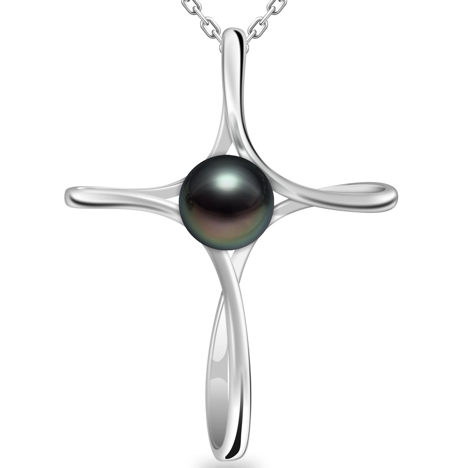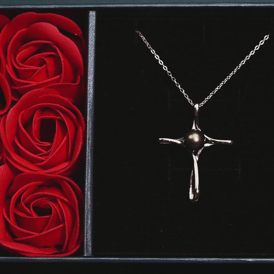 Tahitian Black Pearl Gifts for Women Wife Wedding Birthday Anniversary Valentines, 7-8MM AAAA 18K White Gold Plated Sterling Silver Religious Cross Pendant Necklace