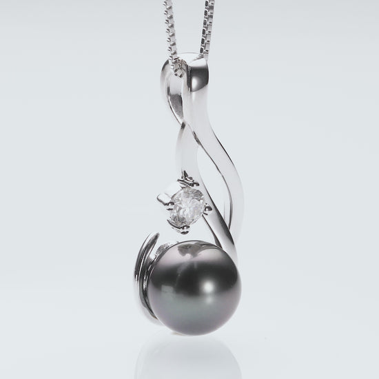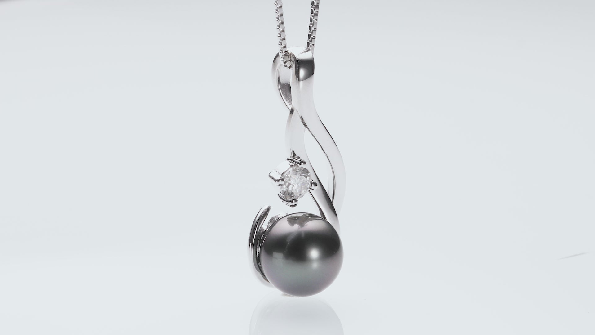 - This chic pendant features a 9-10mm Tahitian Black Pearl, handpicked for its radiant luster, overtone and perfect round surface. The pearl is mounted on 14K white gold plated sterling silver in a gorgeous leaf-like design. With a 0.3ct D color moissanite, creating an amazing visage of deep dark beauty and brilliance of moissanite's fire.
